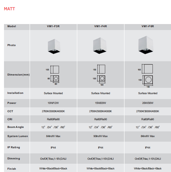 VM1-F from MATT series, is a range of architectural Square surface-mounted downlights,simple design but popular